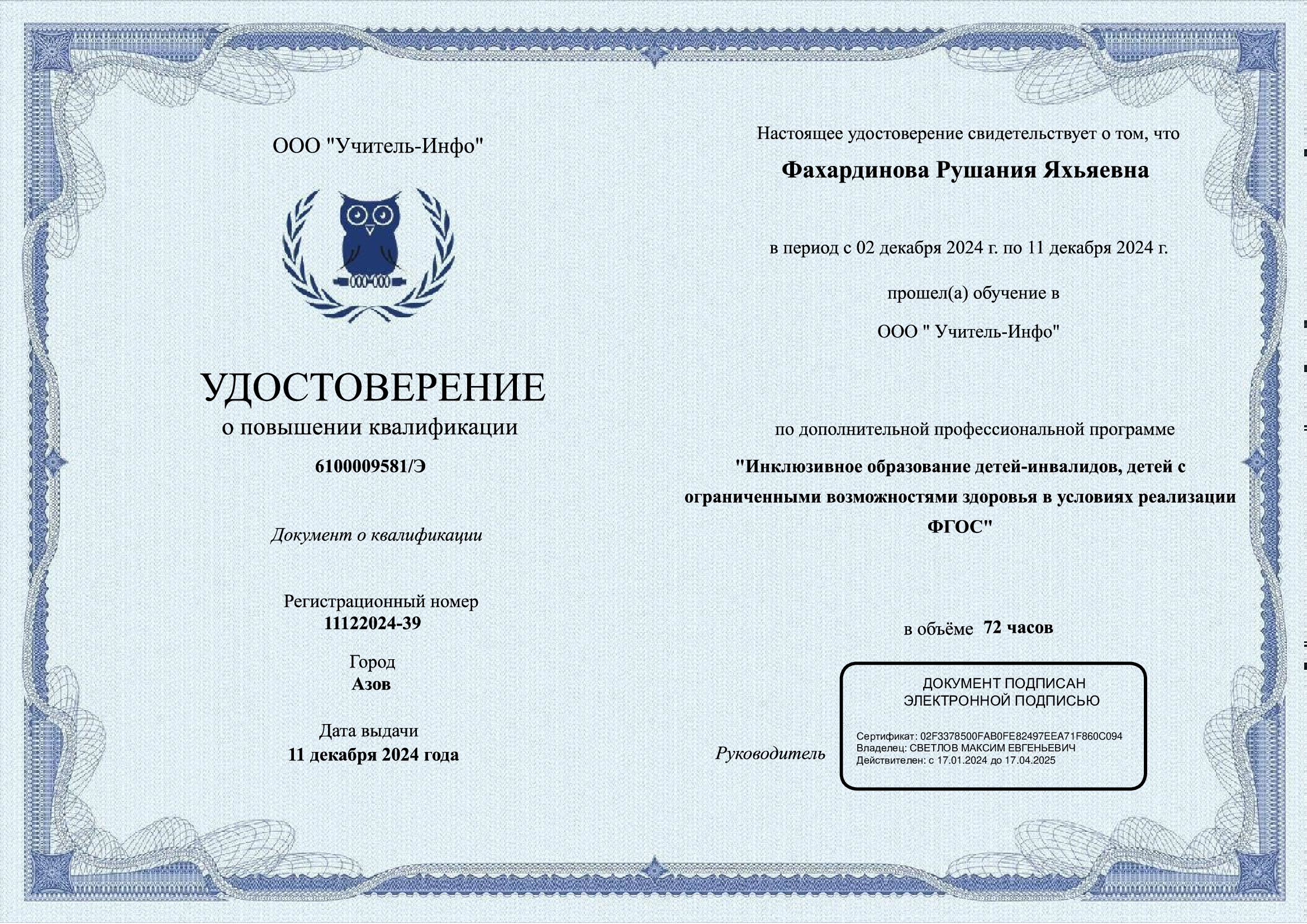 2. Инклюзивное образование детей – инвалидов с ограниченными возможностями здоровья в условиях реализации ФГОС, 72ч., 2024г.